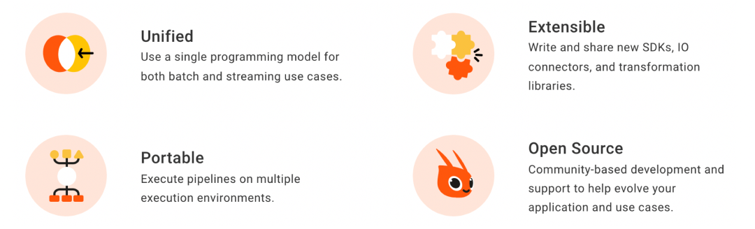 对于主流计算框架的对比,比如 Apache Flink、Spark Streaming、Storm,网上有很多资料,大家也请自行调研就好 。Apache Flink 是近几年发展很快的一个用于分布式流、批处理数据处理的开源平台。它是最贴合 DataFlow 模型实现的分布式计算框架。基于流计算进行高性能计算,具有良好的容错、状态管理机制和高可用能力;其他组件于 Flink 的集成也越来越多、也日趋成熟;所以选择我们 Apache Flink 做为我们的流批计算引擎。分布式数据处理技术不断发展,优秀的分布式数据处理框架也会层出不穷。Apache Beam 是 Google 在 2016 年贡献给 Apache 基金会的孵化项目,它的目标是统一批处理和流处理的编程范式,做到企业开发的数据处理程序可以执行在任意的分布式计算引擎上。Beam 在统一编程范式的同时也提供了强大的扩展能力,对新版本计算框架的支持也很及时。所以我们选择 Apache Beam 做为我们的编程框架。