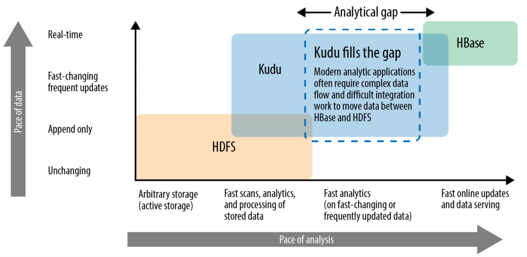 在 Hadoop 生态系统存储组件中,一般用 HDFS 支持高吞吐的批处理场景、用 HBase 支持低延迟,有随机读写需求的场景,但很难只使用一种组件来做到这两方面能力。另外,如何做到流式计算下的数据实时更新,也影响存储组件的选择。Apache Kudu 是 Cloudera 开源的列式存储引擎,是一种典型的 HTAP (在线事务处理/在线分析处理混合模式)。在探索 HTAP 的方向上,TiDB、OceanBase 均在此行列,只是大家起初侧重的场景不同而已,大家也可以对比一下。ApacheKudu 的愿景是 fast analytics on fast and changing data。从 Apache Kudu 的定位,如下图可见一斑: