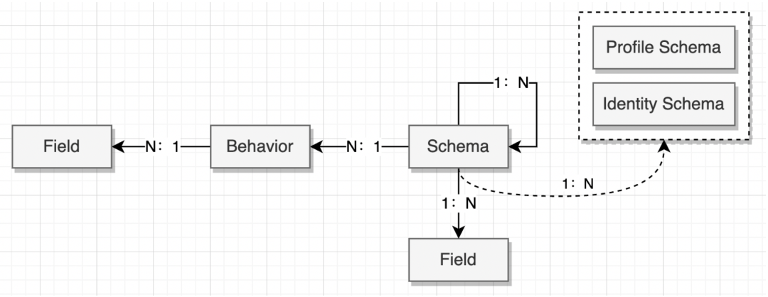 前面提到企业的多个渠道的数据特征结构各异。再加上不同租户业务特点不同,企业需要数据自定义的扩展性。RT-CDP 为了两类问题需要具备数据结构灵活定义的能力来对接企业数据。另外,RT-CDP 本身管理两类数据:碎片化客户数据和用户统一画像。对于前者来说,不需要关系数据内容本身,利用数据湖等技术即可为企业提供数据存储、查询、分析能力,是偏 Schemaless 的数据管理;对于后者来说,更多需要按不同维度组合查询、圈群、分析,本身需要结构化的数据管理。后者能否通过 Schemaless 的方式提供服务呢?罗列增删改查的场景,反证一下局限明显。Schema 是一个数据结构的描述,Schema 可以相互引用,可以对数据中字段以及字段类型、值进行约束,也可以自定义字段。企业可以用一个统一的规范快速接入、灵活管理自己的数据,比如企业可以根据自己的行业特性,抽象不同的业务实体、属性,再给不同的业务实体定义不同的 Schema。企业可以对业务实体有交集的信息抽离新 Schema,然后多个 Schema 引用这个新 Schema;也可以对每个 Schema自定义自己的业务字段。企业只需要按相应的 Schema 结构接入数据,就可以按特定的标准使用这些数据。从这几个实体来说明 Schema 的特点,如下图:- Field:字段是最基本的数据单元,是组成 Schema 的最小粒度元素。
