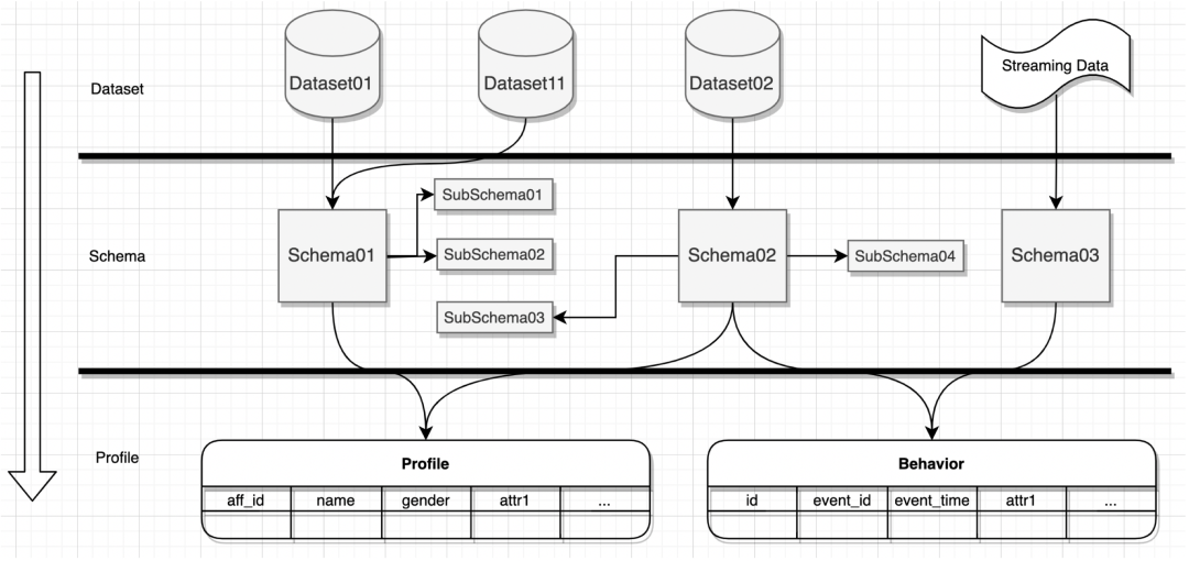 在上图所示,爱番番 RT-CDP 在进行行业抽象后,已经内置了很多行业通用的 Schema,包括常见的 Identity、Profile、Behavior 等多类 Schema。在爱番番 RT-CDP 管理的统一潜客画像中,Identity、Profile、Tag、Segment 等都业务聚合根。为了支持好 B、C 两种数据模型还有一些 B 粒度聚合根存在。这里需要先说一个 Dataset 的概念。Dataset 是通过 Schema 定义结构的一个数据集,企业对不同的数据源定义成不同的数据集。在数据源管理时,企业可以根据不同的数据集结构化导入的数据,一个数据集可以对应多个数据源,也可以对应一个数据源中的一类数据,一般后者使用较多。另外,一个数据集也可以包含多批次的数据,也就是企业可以周期性的按批次导入同一数据集数据。在数据接入时,如下图,针对不同的 Dataset,企业可以绑定不同的 Schema,每个 Schema 可以引用、复用其他子 Schema,然后经过 RT-CDP 的 Schema解析,自动将数据持久化到存储引擎,根据数据的定义不同,会持久化到不同数据表中。对应实时的客户行为也是通过定义不同的 Schema 来定义数据结构,然后进行持续的数据接入。