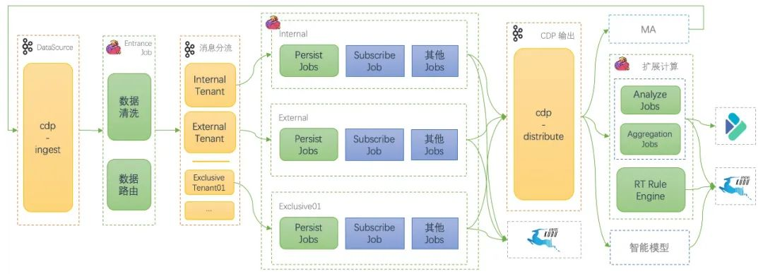 - RT-CDP 有个统一的入口 Job (Entrance Job) 负责数据的清洗、校验、Schema 解析以及身份识别等,然后根据租户属性进行数据分发。因为这是 RT-CDP 入口 Job,需要支持横向扩缩,所以这个作业是无状态 Job。