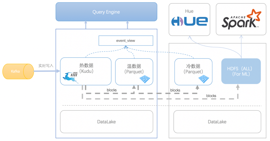 完全基于 Kudu 存储数据的话,一方面成本较高 (Kudu 集群都要基于 SSD 盘搭建才能有比较好的性能表现);另一方面在营销场景下更关注短时间段 (比如近一个月、三个月、半年等) 客户的实时行为变化,对于时间较久的历史数据使用频次很低。综合考量,也从节约资源成本角度,我们选择 Parquet 做为扩展存储,针对存储符合时间序列的海量数据做冷热分层存储。根据数据使用频率,我们将数据分为热、温、冷三层。热数据,表示租户经常使用的数据,时间范围为三个月内;温数据,表示使用频率较低的数据,一般只用于个别客群的圈选,时间范围为三个月外到一年;冷数据,租户基本不使用的数据,时间范围为一年之外。为了平衡性能,我们将热、温数据存放在同一个集群,将冷数据放在另外集群 (和提供给策略模型的集群放在一个集群)。- 在热、温、冷之上建立统一视图,上层根据视图进行数据查询。