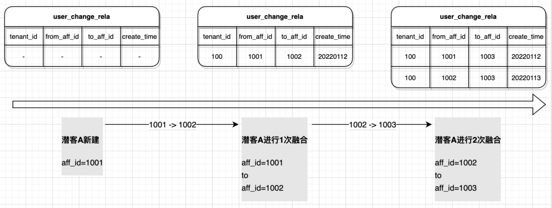 针对融合关系表,我们做了一定的策略优化:不维护路径上的过程关系,而是只维护路径所有过程点到终点的直接关系。这样即便在潜客融合路径涉及过多潜客时,也不会过多增加关系查询的性能。举个例子潜客发生两次融合 (affId=1001 先融合到 1002 上,再融合到 1003 上) 时的 user_change_rela 的数据变化情况,如下图: