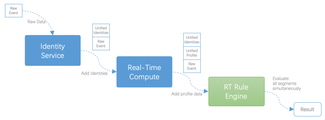 为了规则灵活度和高效的数据处理能力,我们定义了一套规则解析算法。然后借助 Flink 强大的分布式计算能力和状态管理能力驱动实时规则引擎计算。上面已经说了流数据理念,这里结合一条潜客行为进来到实时规则判断来更直观说明数据在流中的实时填充,如下图:数据进来之后,先经过 Identity Service 补充身份 Ids,在经过数据 Job 补充潜客对应的属性信息,最后基于一个完整的潜客数据进行实时规则判断,最后将负责规则的潜客落入 Segment表。