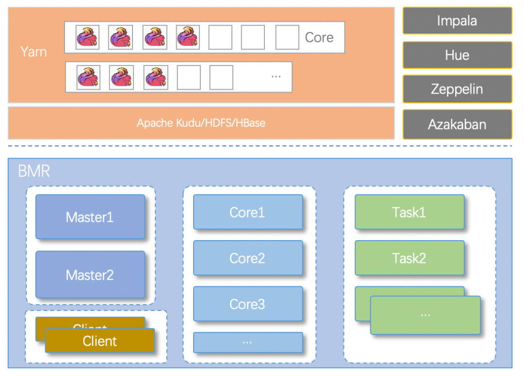 我们的集群主要分为四类节点:Master、Core、Task、Client。具体如上图。- Master 节点:集群管理节点,部署 NameNode、ResourceManager 等进程,并且做到组件故障时的自动迁移;