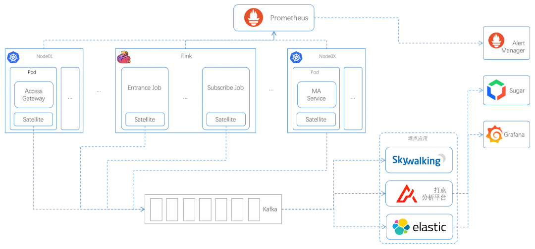 具体如上图,我们依托爱番番强大的技术服务能力完成了跨平台的日志采集 & 报警和全链路的延时监控:- 日志采集:基于爱番番贡献给 Skywalking 的 Satellite 收集全链路服务日志,支持了 K8s 下微服务的日志收集,也支持了 Flink Job 的日志采集,做到一个日志平台,汇集全链服务日志。然后通过 Grafana 进行日志查询、分析;