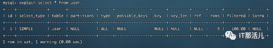 Explain用法其实不难,只需要在SQL语句前加上该关键字即可,例如explain select * from user,示例结果如图: