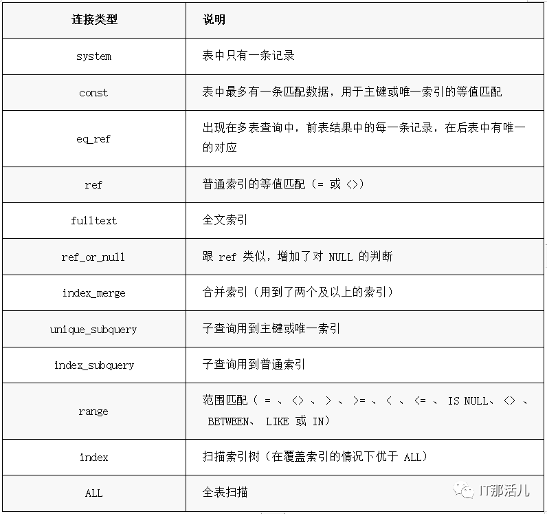 优化目标:越往上性能约好,尽可能使用上面的type类型,避免ALL全表扫描。