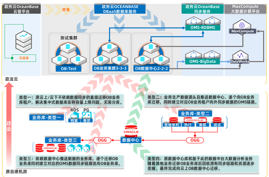 对数据生产源头且推送数据中心的第二类核心业务(审判、执行、送达、案款),逐个向云上 OB 迁移,同时建立相应的数据同步链路。