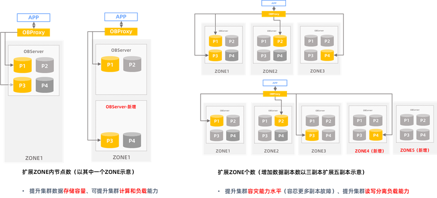 OceanBase业务透明在线扩缩容,数据、负载自动重平衡示意