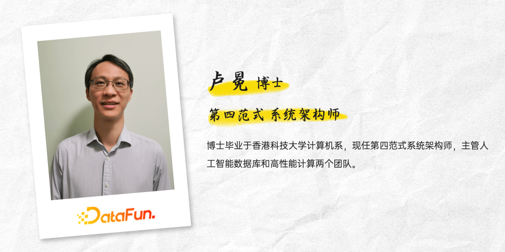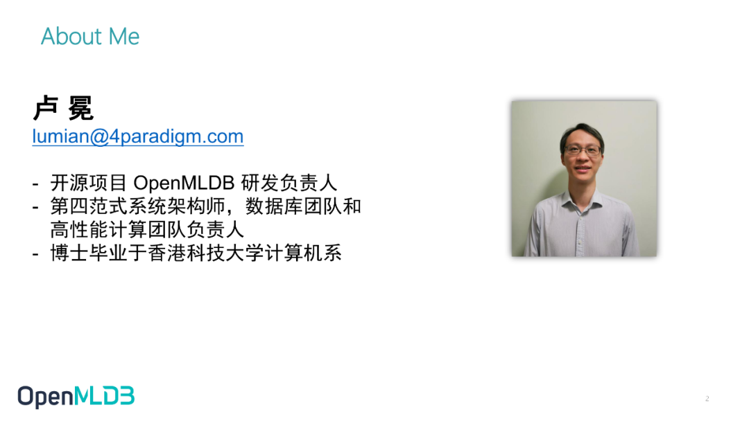 介绍一下我自己,我叫卢冕,目前在第四范式担任系统架构师,主要负责数据库团队和高性能计算团队,同时也是开源项目 OpenMLDB 的主要研发负责人,目前主要专注于数据库系统和异构计算。