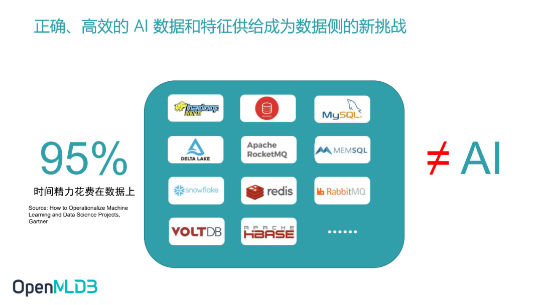 首先来看一下背景之一——当前人工智能工程化落地过程中所面对的数据和特征挑战。通过统计数据,我们了解到如今企业在推进人工智能落地的时候,可能会将 95% 的时间都花在数据问题的处理上,数据治理的问题亟待解决。虽然今天我们能在市面上看到非常多的开源或是商业的数据解决方案,例如 Hadoop、MySQL 等已经向大家提供了丰富的解决方案。