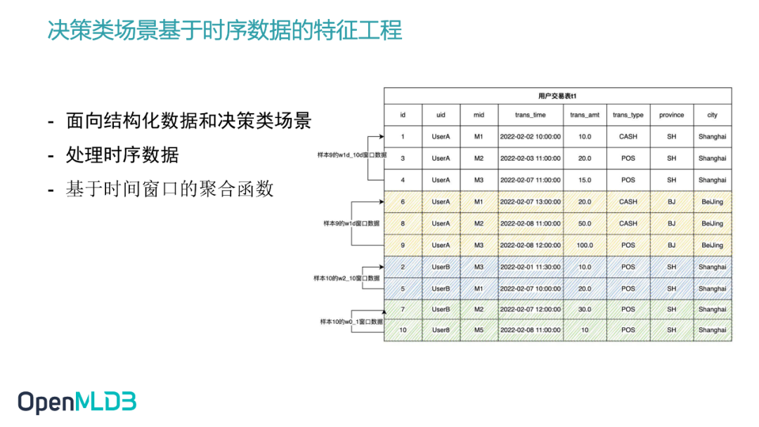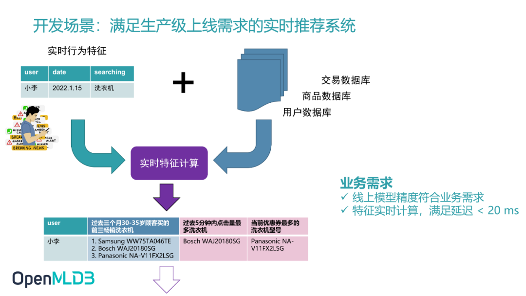 在 AI 工程化落地的这个过程当中,MLOps 成为一个非常流行的概念。相信大家或多或少都对此有些了解。MLOps 概括了人工智能机器学习工程化落地的完整生命周期所需要的一些工具以及服务。下图展示的是 MLOps 运作的闭环流程,可以看到它会分为离线开发和线上服务两个部分。在机器学习相关的开发中,我们常常会把工作流程拆分为模型的训练和上线,这两套流程存在较大的差异。当我们把这两套流程放置在企业级的生产场景中,它们可以进一步地拆解为DataOps、FeatureOps和ModelOps。这次分享将集中关注 FeatureOps,谈论如何通过 OpenMLDB 这一个线上线下一致的生产级特征计算平台去解决特征计算、特征存储、线上实时特征计算以及特征服务的问题。可以注意的是,画面下方线上服务部分这一块还加入了一个环节——ProductionOps,它是企业人工智能工程化落地时一个非常重要的环节。在生产环境之下,企业会非常看重高可用、可扩缩容、平滑升级、实时监控这些企业级核心。所以 ProductionOps 也是我们做 FeatureOps 过程中非常关注的内容。本次内容分享的背景之二是 OpenMLDB 所触发的应用背景。目前 OpenMLDB 面向的主要场景是决策类场景,是基于实际数据的这种特征工程。这里的关键词有三:其中的结构化数据,简单来说指的是表数据。而决策类场景指的是区别于基于深度学习的感知类产品所面向的角色类场景,更多应用于实时推荐系统、风控系统、反欺诈系统等企业业务系统的场景。所谓的时序数据,就是所有的数据记录都会带有一个时间戳,如图中数据表格里的第四列就包含着时间戳。在实际生产当中特征工程基本上都是对这种时序数据去做这个时间窗口上的聚合函数,这也是我们处理最多的特征工程。下面我们会从业务角度举例,说明生产级特征工程所面向是两大业务需求:以实时推荐系统为例,比如小李同学,在某个时间点想买洗衣机,去搜索洗衣机,触发了搜索行为以后,后面整个特征计算会做什么?首先进来的实时行为特征,这三个原始的特征就是 User ID,data 以及他在搜索的产品。如果我们只是拿这三个特征去做模型训练和推理,是达不到一个业务需求的模型精度的。