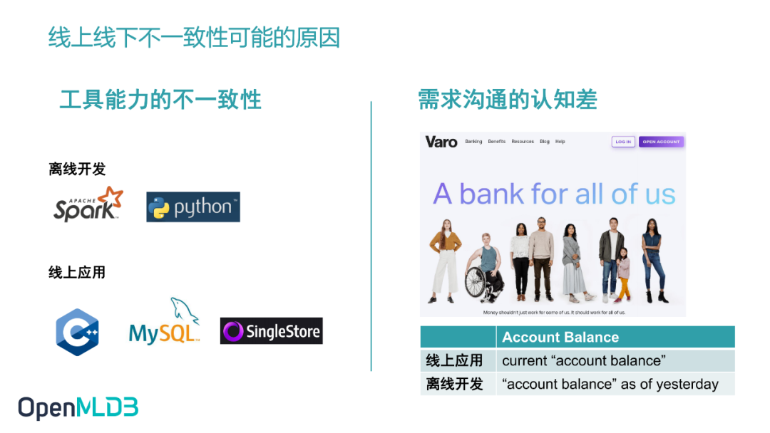在这两个业务需求之下,特征计算平台从开发到上线的全生命周期是如何完成的呢?一开始入场的是数据科学家,他们会根据历史数据和业务精度的要求建立一个离线的业务模型,在此过程中设计离线特征脚本。这个特征脚本就是前面提到的过去一段时间内的点击量的特征等等。要如何去抽取这些特征,要定义哪些特征,判断不同的场景中需要开发何种特征脚本是数据科学家的工作,而在这个过程中大部分数据科学家喜欢使用的语言是 Python,一部分科学家也有可能用到 SparkSQL。对于数据科学家而言,主要任务就是开发出高质量模型,并通过数据验证测试使得最后生成的模型质量是符合预期的。而上线后的工程化需求,例如低延迟、高吞吐、可运维性等等既不在他们的工作职责之内,也不是数据科学家擅长解决的问题。当工作进展到业务上线的部分时,会有工程化团队来负责,并进一步介入 AI 落地。工程化团队需要去把数据科学家完成的脚本做重构,他们会用一些高性能数据库,甚至用 C++ 重新搭建一套特征抽取的服务,使得上线的产品能够满足业务的实时计算低延迟性能需求。那么是否经过数据科学家和工程化团队的接力开发处理,产品就能完美上线了呢?在实际的工程化落地中,答案是是否定的。因为中间还缺了很重要的一步——线上线下计算逻辑一致性校验。计算逻辑一致性校验,简单来说就是数据科学家和工程化团队生产的模型的精度需要达成一致。最本质问题在特征计算方面,要保证特征抽取的计算逻辑一致。这个地方大家可能听起来很简单,但实际上做起来是不容易的,对齐联调所需要的人力成本、测试成本和修护成本非常庞大。在我们以往的客户服务实践中,一次性校验往往花费数月甚至接近一年的时间去反复校验。而投入大量成本去反复验证,自然是因为线上线下经常出现不一致性。离线开发和线上应用,使用的工具栈和开发栈可能是完全不一样的。离线开发数据科学家更偏好于像 Python、Spark这种这种工具;做线上应用的时候,讲究高性能、低延迟,就需要用一些高性能的编程语言或者数据库来做。当我们有两套工具的时候,它们覆盖的功能范围是不一样的,比方说做离线开发的时候,使用的是Python,可以实现很复杂的功能,而线上MySQL的功能就会受限于于SQL。工具能力的不一致性,就会造成做一些妥协的局面,产生的效果就不同。这不是一个技术问题,但是在实际工程落地当中非常重要。这里我们举一个例子,Varo,一家非常有名做线上银行的公司,在美国有很多的用户,他们的工程师提到了需求沟通认知差的问题。关于如何定义account balance,他们就有一个教训。工程化团队认为这个 account balance 即是上线以后实时的账户余额;但是数据科学家团队为了简化,而采用了昨天结束时候的账户余额。很明显两者之间的认知差,就能造成后面的整个训练效果的不一致性,从而导致了他们的应用里出现了非常严重的线上业务问题。其实不光是这家银行,在第四范式整个项目实践的周期经验当中,我们都或多或少都碰到过这种沟通认知差带来的问题。一旦出现这种问题,排查的成本其实还是非常高的。当然原因是多样的,这里我们只列举了两种最重要的原因。