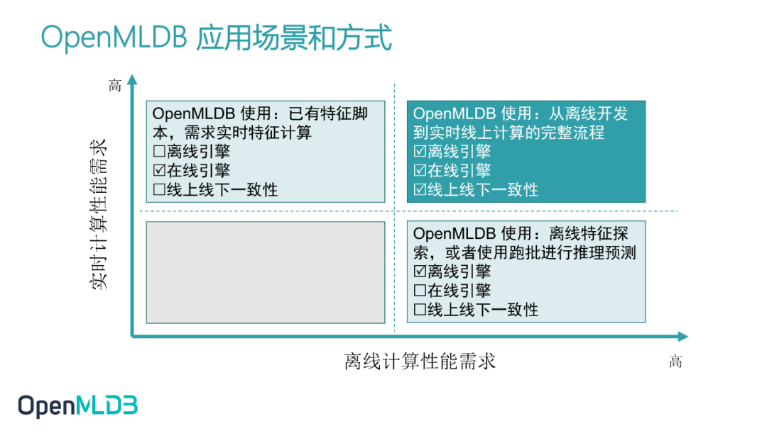 OpenMLDB使用场景:覆盖离线开发到实时线上计算的完整流程,满足高计算性能需求和实时计算需求,同时也满足纯离线开发及实时线上计算需求。