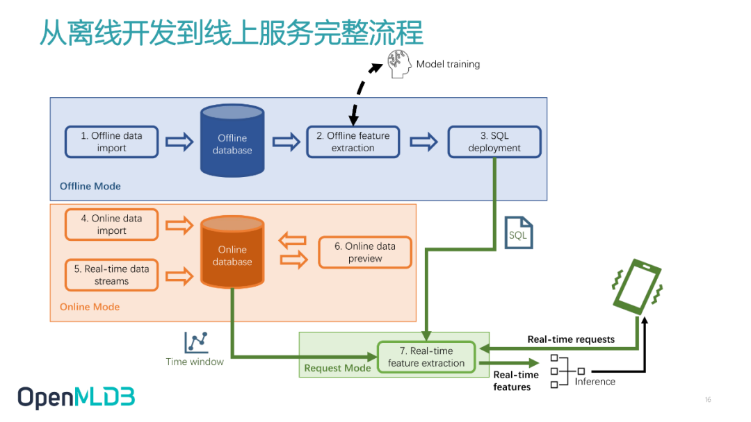 首先,我们会做离线的模式,把离线的数据导到 OpenMLDB,可以是软链的导入方式。此处的 Offline database 是一个虚拟概念化的存在,此时我们就可以做一个离线模型特征脚本的开发,在这个过程中和 Model training 可能也会有一个交互,要反复去调整。待到性能达到预期后,我们可以做一个动作,即 SQL deployment。把 SQL 部署上线,那么 OpenMLDB 的部署模式就会从 Offline 转至 Online。