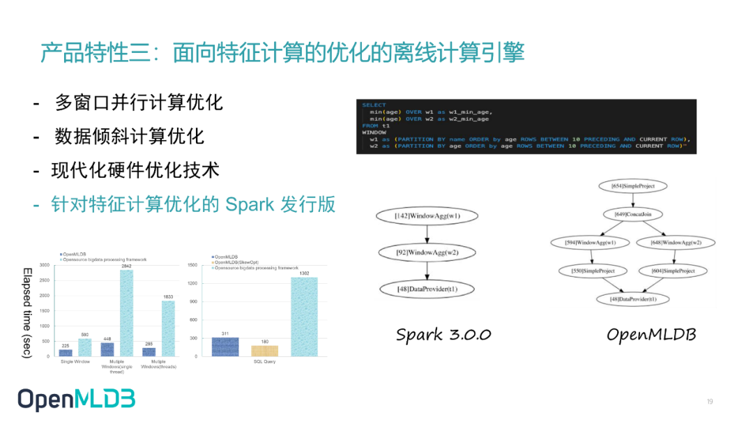 第三个特性就是离线计算引擎的优化。离线计算引擎是基于 Spark 的优化的版本,我们不是把原始的 Spark 直接拿来的,而是针对特征计优化做了一些措施,比如右边这个图,叫做多窗口的一些并行计算优化:SQL 定义了两个窗口,是在不同的 key 上面,一个是 group by name,一个是 group by age,这是两个时间窗口,在 Spark3.0 上翻译出来,这两个窗口会串行地去执行,有时候没法完全的非常好地利用集群的资源,所以我们在这里就改动了 Spark 的源代码,使其可以并行执行起来的,从而提升效率。这是其中的一个改动,其他的还有比如数据倾斜的优化,都是基于在 Spark 发行版里面去做的一些优化。左下角这个图显示了我们目前的版本和 Spark 原始版本的性能比对,可以看到,达到了一个非常显著的性能提升,特别是针对特征工程相关的操作。④OpenMLDB 产品特性四:针对特征工程的 SQL 扩展