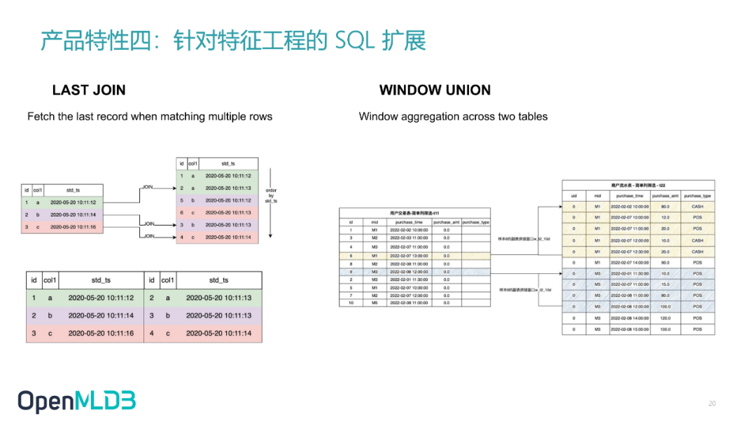 特征四涉及到一个很常听到的疑问。因为我们是基于 SQL 去做这个特征工程,那大家很自然的会有一个问题——SQL 的表达能力是否足够?我们的回答是,原生的标准的 SQL 对某些比较复杂的特征处理逻辑上其实不是那么友好。但是,在 OpenMLDB 中,我们做了SQL语法和功能的扩展。最典型例子是图片左边展示的 LAST JOIN,它能够在左表匹配到右表多行的时候只取最近的一条或者设定的某一条。这种场景在机器学习的这个训练里面有很多应用。还有一个例子是 WINDOW UNION 的语法,从直观来理解,其实是做了一个跨表的窗口聚合操作。比方说这个左表(也是主表),左表的这个时间戳可以在右表的匹配的数据集上画一个时间窗口,在右表做一个聚合,然后把聚合结果拼到左表上。跨表聚合是 WINDOW UNION 所要达到最主要目的,当然它还有一些更复杂的用法,大家可以去参考我们的语法文档。基于语法扩展和功能扩展,OpenMLDB 中 SQL 目前的表达能力是足够的。当然我们也看到社区用户其实可能有一些更高的要求,特别是针对一些这个计算函数,我们也在不断的扩展可能的新语法,包括新的 build in 函数,这块内容也非常欢迎大家来和我们一起做。