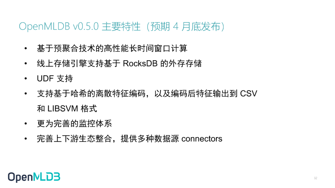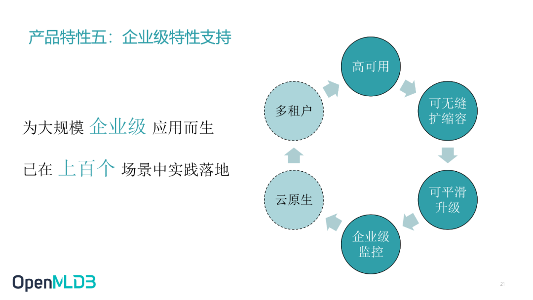 第五个非常重要的特性涉及到 OpenMLDB 的历史,它是从第四范式的商业产品转化而来,在开源之前已经应用于很多大规模的企业级应用里了,且在上百个场景里面都经过了实践。所以我们非常看重如何真正落到企业大规模企业级应用里的一些 feature,比方说高可用、扩缩融、平滑升级和企业级监控在如今的 OpenMLDB 中都是支持的。