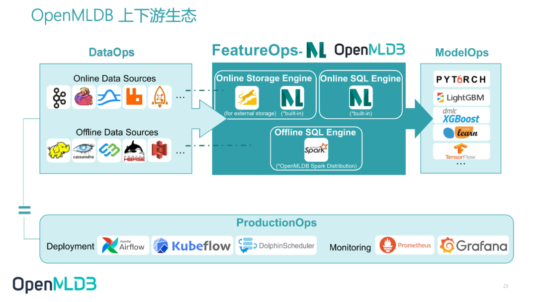 OpenMLDB生态构建:加速链接DataOps(Pulsar、Kafka等)、ModelOps(TensorFlow、PyTorch、LightGBM等),无阻对接ProductionOps(Airflow、DolphinScheduler等),围绕 OpenMLDB 构建面向机器学习应用及上线全流程的上下游生态。