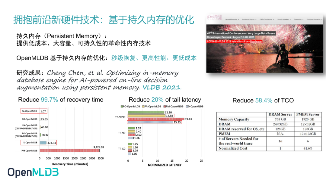 持久内存是英特尔在大概 18、19 年左右,发布了真正工业界第一款企业级的持久内存应用——奥腾持久内存。那么持久内存有什么优势呢?首先它成本低,它的单位价格是 Dram的 1/3~1/4 左右。当然它的性能也会比 Dram 稍微差 1/2 或 1/3 左右,但是比 SSD 还是会好一个量级的。其次容量大,一条持久内存可以最高到 512 GB,一台服务器上就很容易达到几个TB。还有一个非常革命性的技术,就是可持久性的内存。现在的 Dram 掉电以后数据都没了,而 Persistent memory 掉电以后这个数据还在,这个是一个非常革命性的技术。我们把持久内存跟 OpenMLDB 线上执行引擎已经结合了起来。前面提到了线上执行引擎的特点,首先它是一个基本上是基于纯内存的执行引擎,所以把它运行起来的成本有时候还是挺高的,如果场景特别大,为了满足内存需求,需要十几台机器,才能运行起来。同时它也有恢复时间慢的问题,因为它一旦掉电,需要从外部存储重新构建内存镜像,需要较长的时间。于是我们就把持久内存跟 OpenMLDB 的线上引擎给结合起来,达到了三个非常好的效果:- 恢复时间从本来的 6 个小时级别降到了 1 分钟。线上业务的意义其实是非常巨大的,线上业务比方说点餐系统,是不允许长时间掉线的,或者不允许某节点掉线以后影响业务的服务质量。结合之后,一分钟就能把这个业务重新拉起来,就不会影响到服务质量。