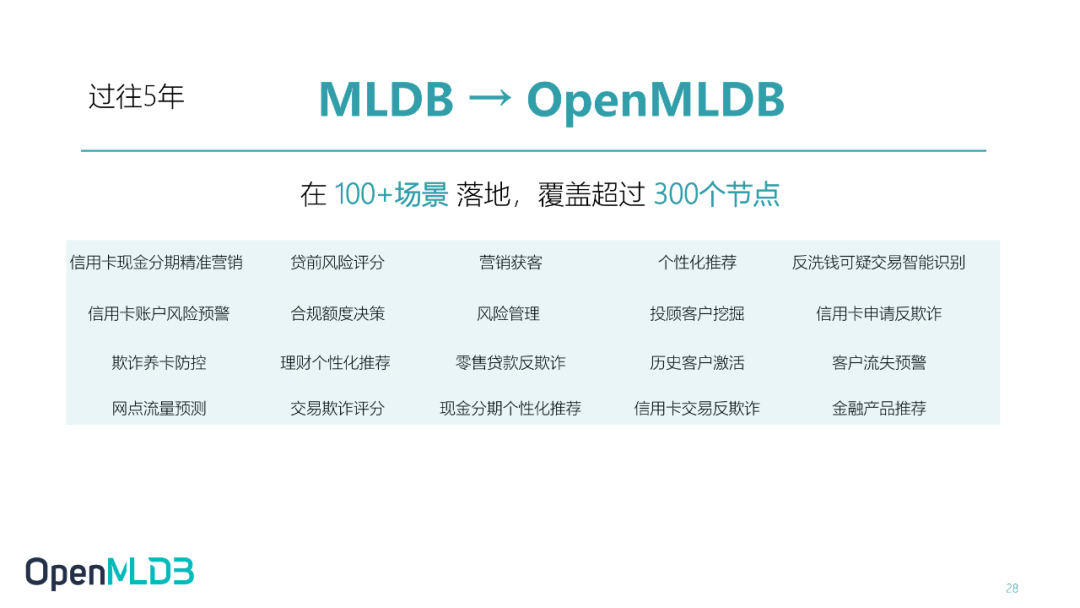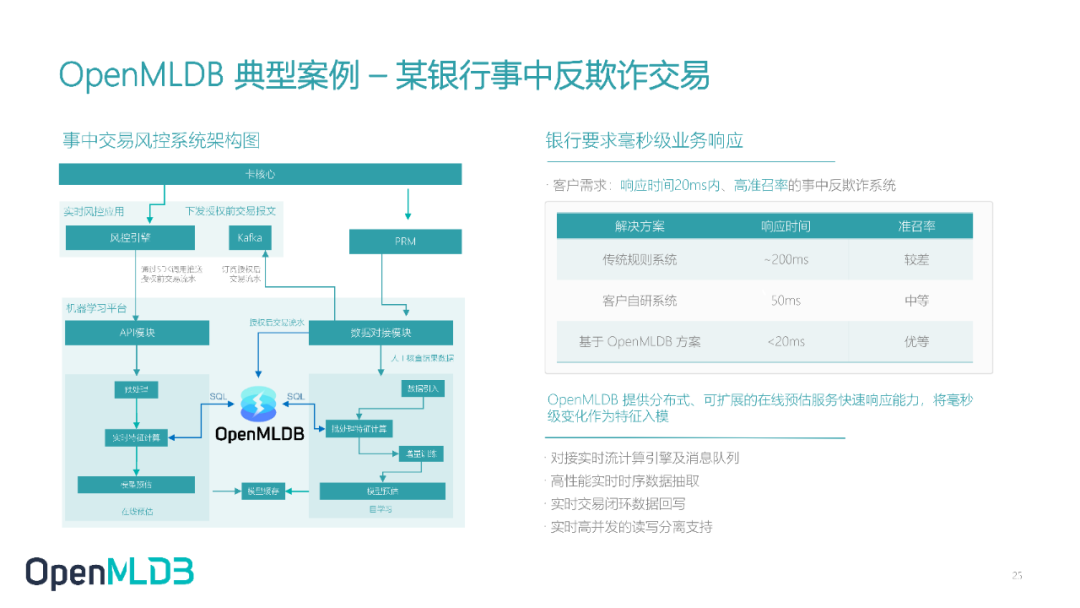 接下来举一个简单的例子,在某银行的事中反欺诈交易场景,OpenMLDB 其实就是处于 FeatureOps 的位置,同时衔接了离线批处理和实时特征计算。然后在某银行的业务场景里,他们对响应的要求是非常高的,需要延迟在 20 ms 以内。可以看到,相比较于它原来传统规则的系统、客户自研的系统,OpenMLDB 提供了一个更好的效果,满足了他们发展的业务需求。其实 OpenMLDB 是从第四范式成立第一天就开始做的产品。经过了 5 年的研发沉淀,OpenMLDB 跟随着商业产品经历了上百个项目的验证,累积了非常多的案例。