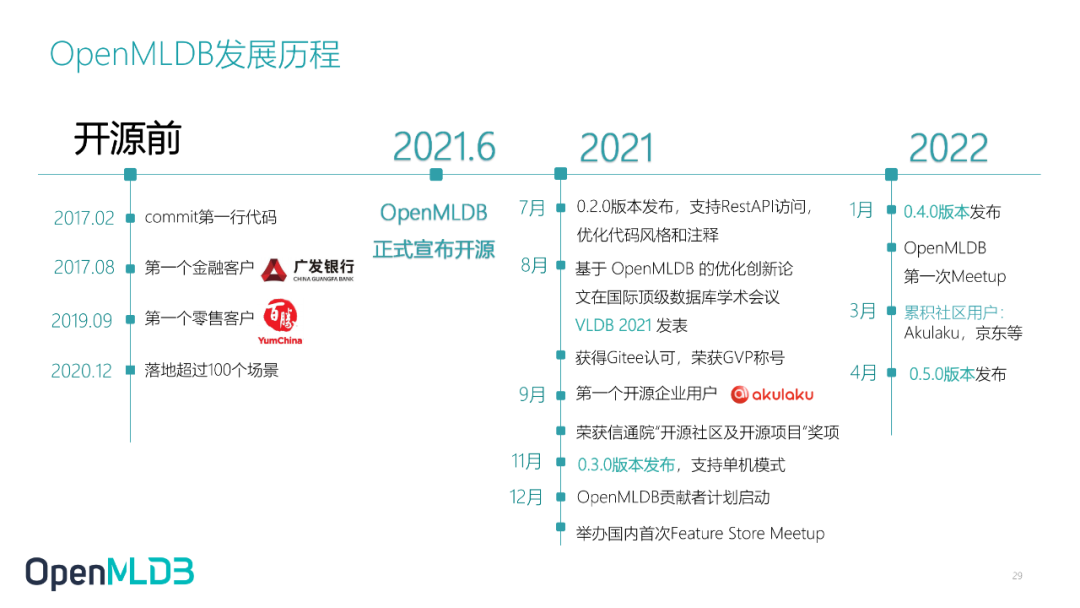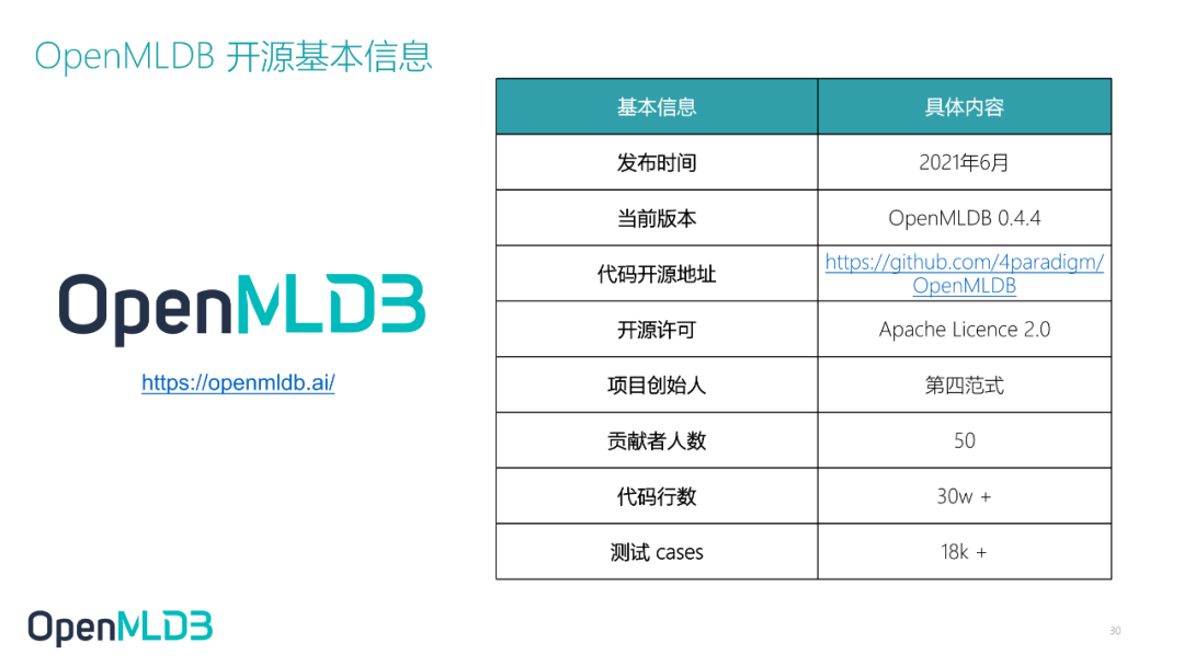 OpenMLDB 真正开源是去年的 6 月,我们其中的关键组件重新从商业平台中抽取出来,做了包装和优化形成了 OpenMLDB 今天的形态,并且对外开源,贡献给社区。我们开源后收获了不错的反馈,去年9月收获了第一个开源企业用户 Akulaku,今年我们也看到很多新团队在不断深入使用 OpenMLDB。2. OpenMLDB 开源基本信息