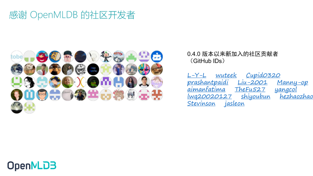 趁这个机会,我想再次感谢一下 OpenMLDB 的社区开发者。到目前为止,共有 51 位开发者加入社区。是大家不断地投入时间精力,OpenMLDB 才能被推动着不断往前发展。从 0.4.0 版本以来,又有 15 位新加入的开发者为社区做出了贡献。在这里,我想表示诚挚的感谢。如果大家对 OpenMLDB 感兴趣,也非常欢迎你作为新伙伴加入。最后想重点给大家介绍 OpenMLDB v0.5.0的新特性,预计在 4 月底发布。