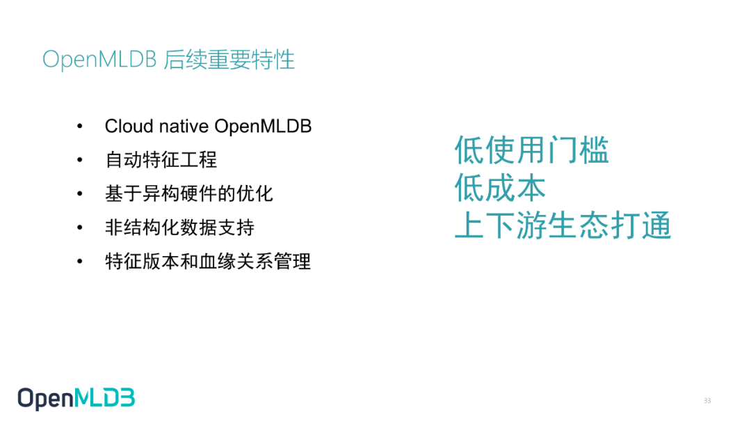 后续规划中 OpenMLDB 特性会朝着三个主要目标去走,三个主要目标就是降低使用门槛,降低使用成本,以及跟上下游生态的打通。