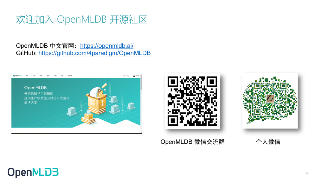 上次 Meetup 时,我预告了官网的上线。如今 OpenMLDB 官网已经顺利推出,欢迎大家访问,或者也可以访问我们的 Github 页面,加入我们的微信交流群,又或是我的个人微信探讨交流。