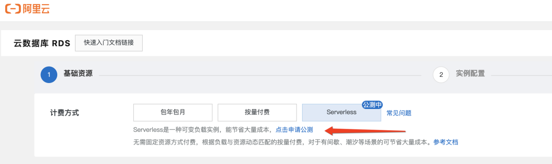 2、在下单页面,计费方式选择"Serverless",然后填写申请公测表单,审核通过以后我们会以邮件、短信的形式通知到您: