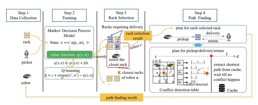 针对上述问题,极智嘉提出全新的自适应任务规划算法。算法在任务分配过程中考虑路径规划的影响,使用在线强化学习(Online Reinforcement Learning,Online RL)方法挖掘订单需求特点,并自适应调整任务分配策略,实现对全局效率瓶颈的精准感知,使优化过程更具有针对性、实时性,从而提高了AMR的运行效率。