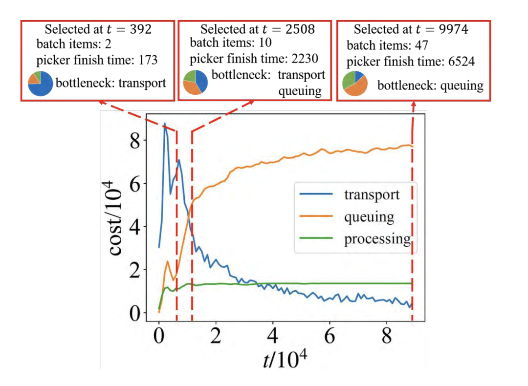 其中马尔可夫决策过程模型中的状态建模中综合考虑了货架和拣货员的工作状态,该建模方法有助于让强化学习智能体(Agent)更好地感知从搬运到拣货全流程中的效率瓶颈。此外,采用在线学习的方法及时更新状态-动作价值函数,进一步提高了算法的自适应性。图2表明了效率瓶颈随时间在不同阶段变化的现象。