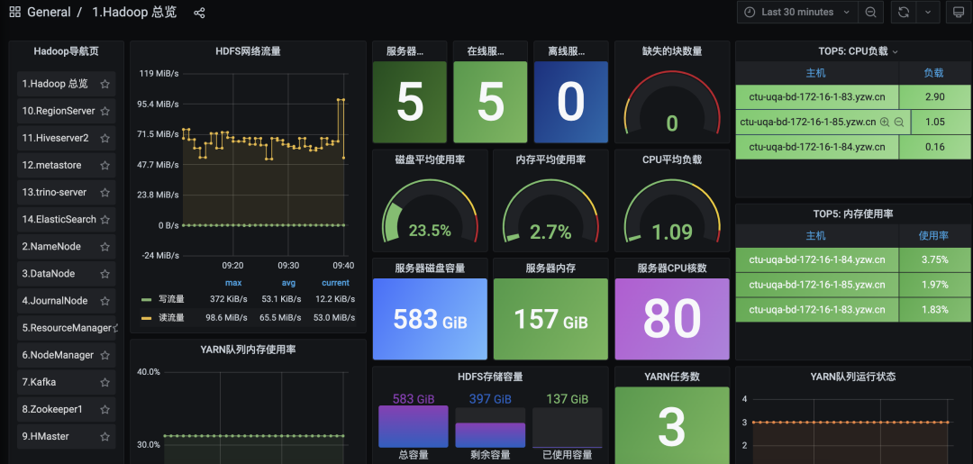 所有组件层面Metrics数据收集之后, 需要有一个地方集中监控维度的看板,在研究行业的通用的技术方案中,grafana是一个比较理想的选择。grafana本身自带了丰富的图表功能,能够连接不同的数据源。比如prometheus、es等。QA环境效果图如下