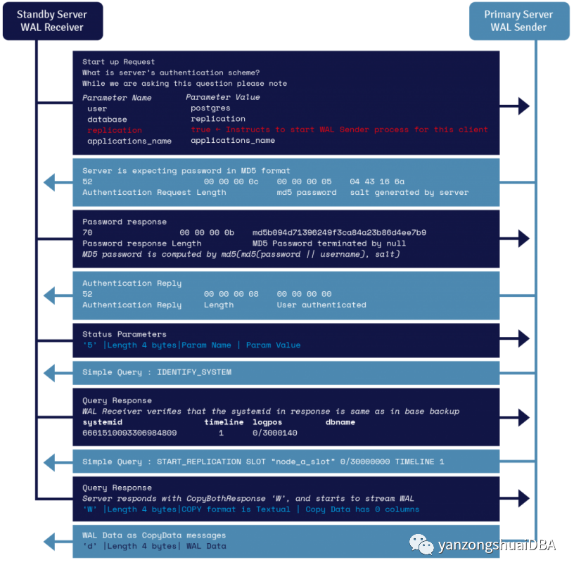 PostgreSQL 数据库中的物理流复制是基于WAL的数据复制。在流式复制中,备用服务器连接到主服务器并使用复制协议接收 WAL 记录。