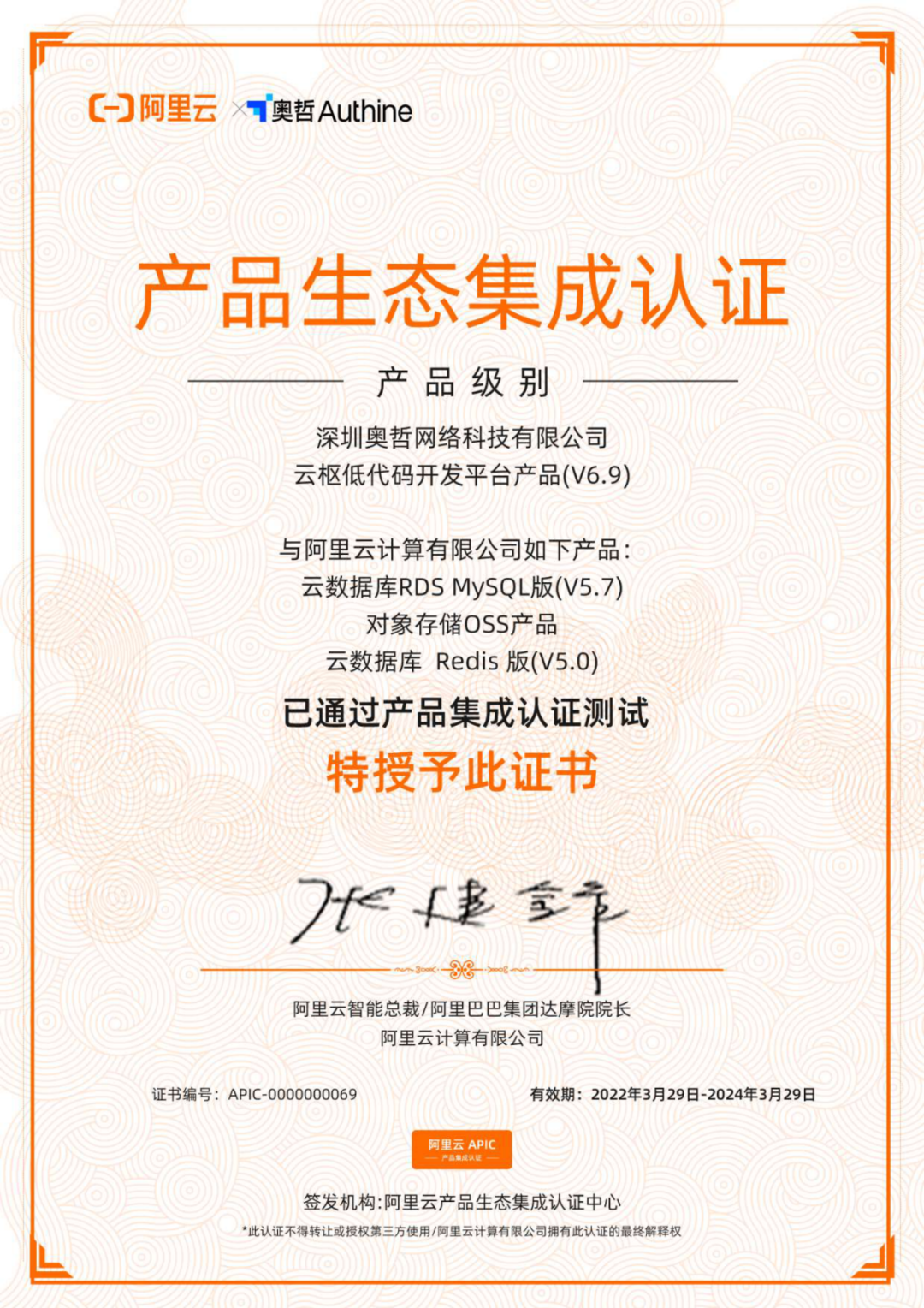 获得此认证,证明了奥哲·云枢的技术能力、产品应用水平已满足阿里云相关产品的适配性要求,奥哲·云枢可基于阿里云为技术底座,为用户提供可靠、有效的产品与解决方案技术服务,这为奥哲与阿里云生态的紧密合作提供了强力的技术保证。
