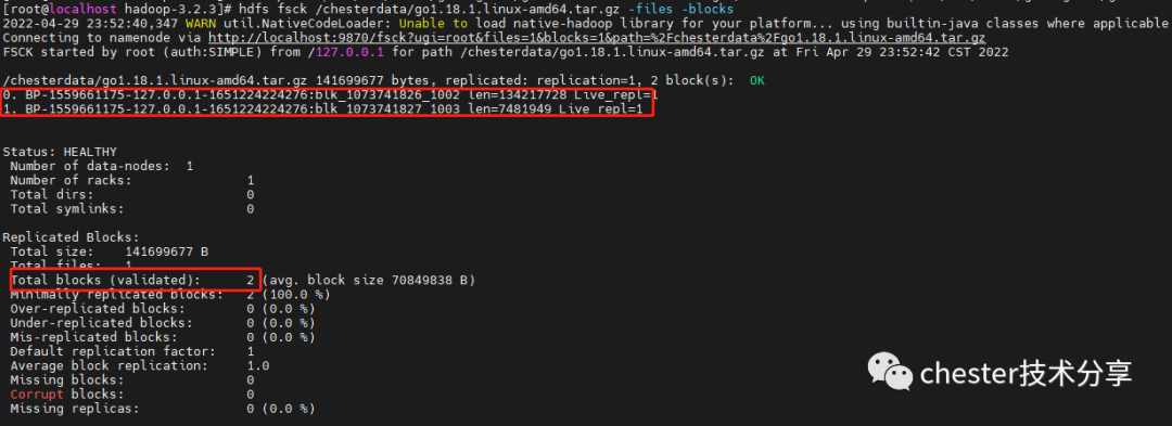 hdfs fsck /chesterdata/go1.18.1.linux-amd64.tar.gz -files -blocks