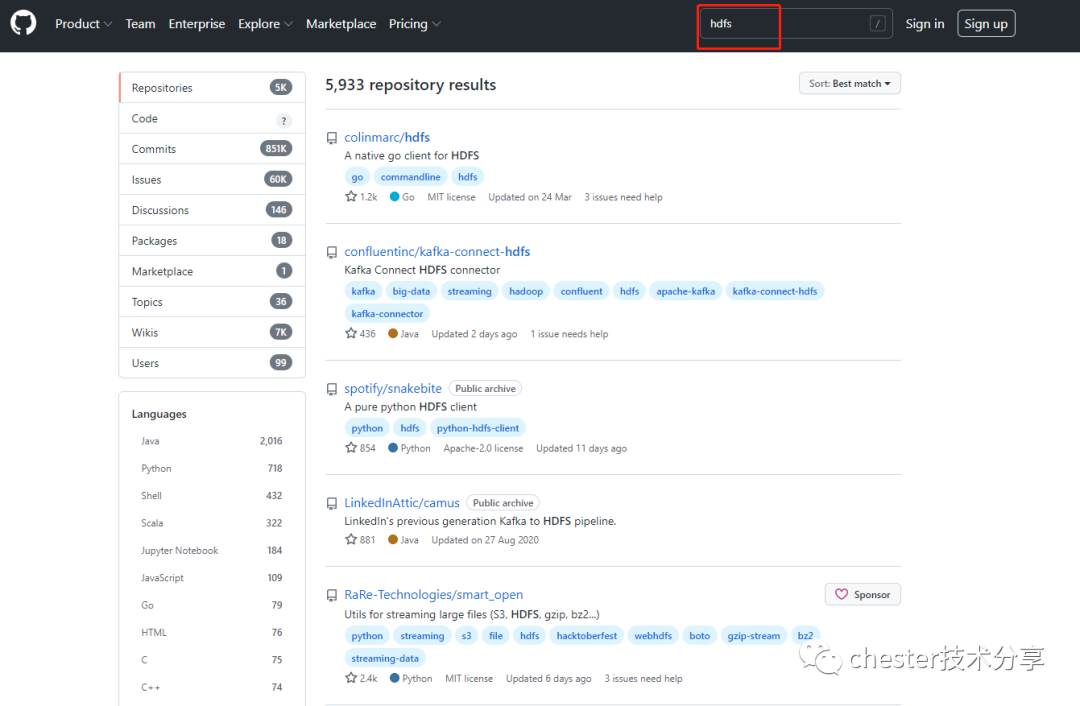 在Github上搜hdfs可以看到哪些语言支持hdfs的操作