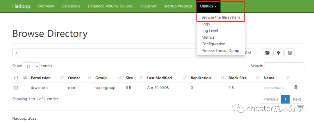 [root@localhost hadoop-3.2.3]# hadoop fs -ls /chesterdata