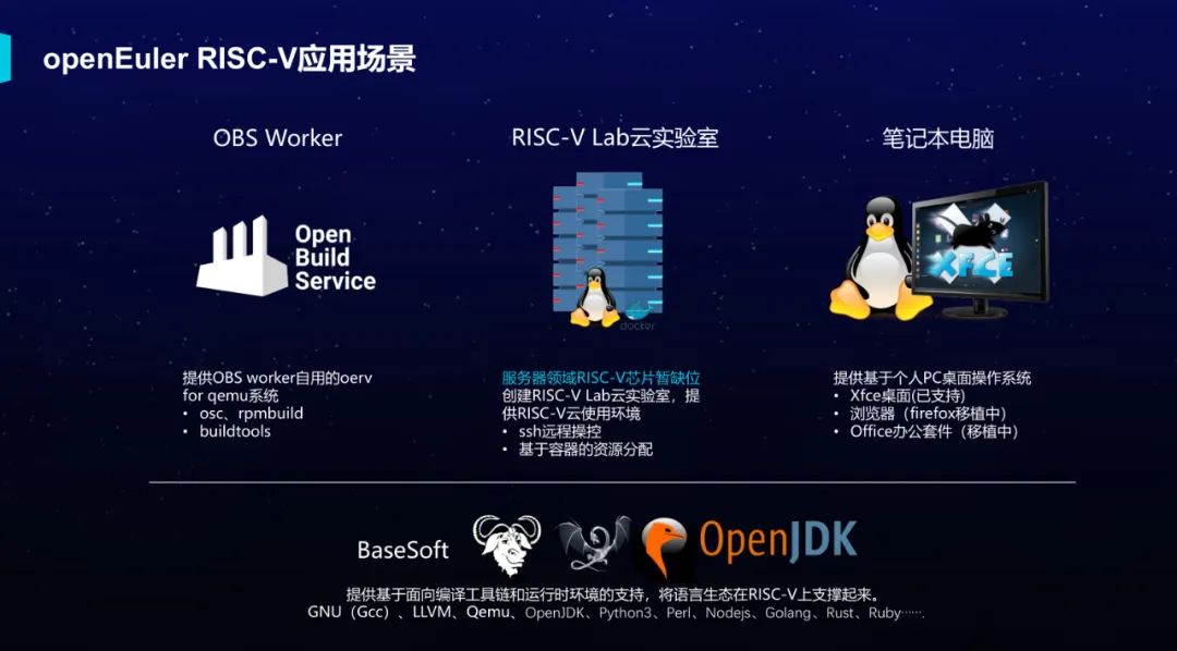 「从功能层面」,RISC-V SIG 目前重点聚焦三大使用场景:基于 RISC-V 的 OBS 模拟构建环境系统、基于 RISC-V Lab 的容器使用场景、基于个人电脑的 RISC-V 笔记本系统。前两种在 2021 年就已经具备,目前,RISC-V 笔记本完成了桌面的支持,firefox 浏览器、LibreOffice 办公套件是 2022 年的主要适配目标。RISC-V SIG 希望在 2022 年能够提供一个 RISC-V 笔记本可用的 openEuler 操作系统。