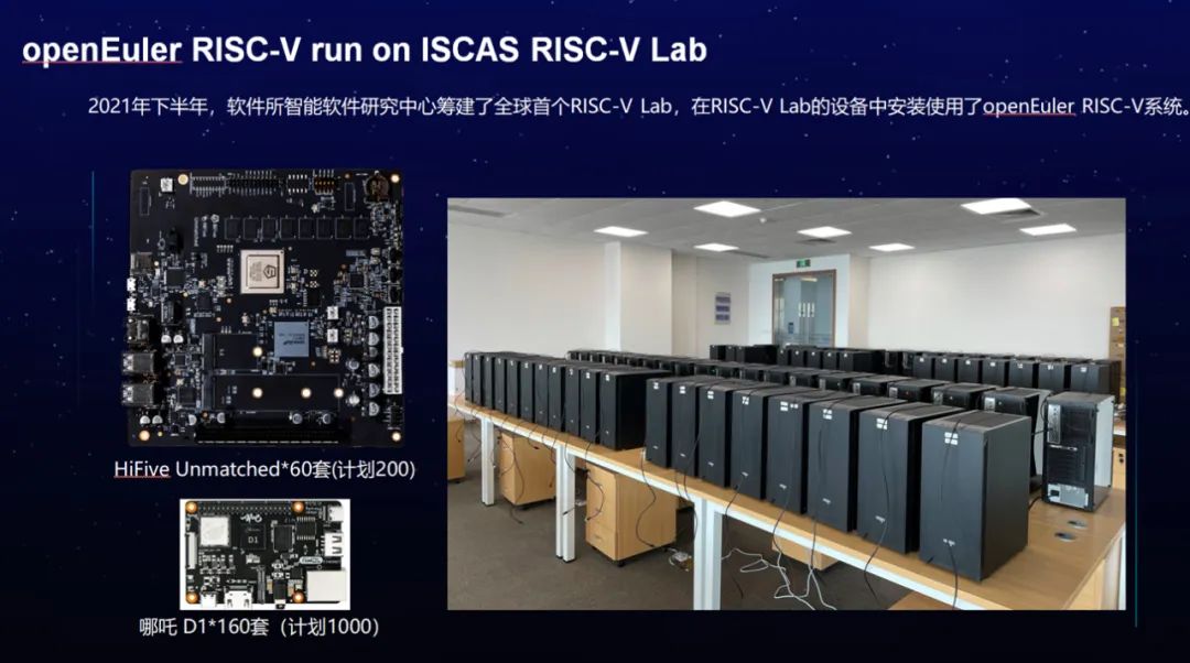 鉴于以上两个原因,openEuler RISC-V 笔记本操作系统是目前最佳选择:硬件虽然性能稍欠,但有可用开发板支持。openEuler RISC-V 笔记本操作系统面向对象是个人用户,包含的软件包范围非常广泛,可以促进完善欧拉开源操作系统 RISC-V 构架下的软件生态。「第二、借助 RISCV Lab 云实验室的基础设施,让 RISC-V SIG 可以适配更多的开发板和硬件。」RISC-V Lab 是一个为全球开源社区提供 CI 基础设施的平台,由 RVI(RISC-V 国际基金会)与中国科学院软件所于 2021 年联合组建,预期规模超 2000 套 RISC-V 开发板,供全球开源社区的开发者使用。在 2021 年,RISC-V Lab 已经部署超过 160 套哪吒 D1、超过 60 套 SiFive Unmatched 开发板,更多型号和数量的开发板正在部署中。在 2022 年,RISC-V Lab 的基础设施将继续扩大和完善。「目前,欧拉开源操作系统已经成为 RISC-V 基金会与中科院软件所 PLCT 实验室合作建立的 RISC-V Lab 默认的操作系统之一。」 借助 RISC-V Lab ,欧拉开源操作系统可以适配更多的开发板和硬件。RISC-V SIG 准备怎么做
