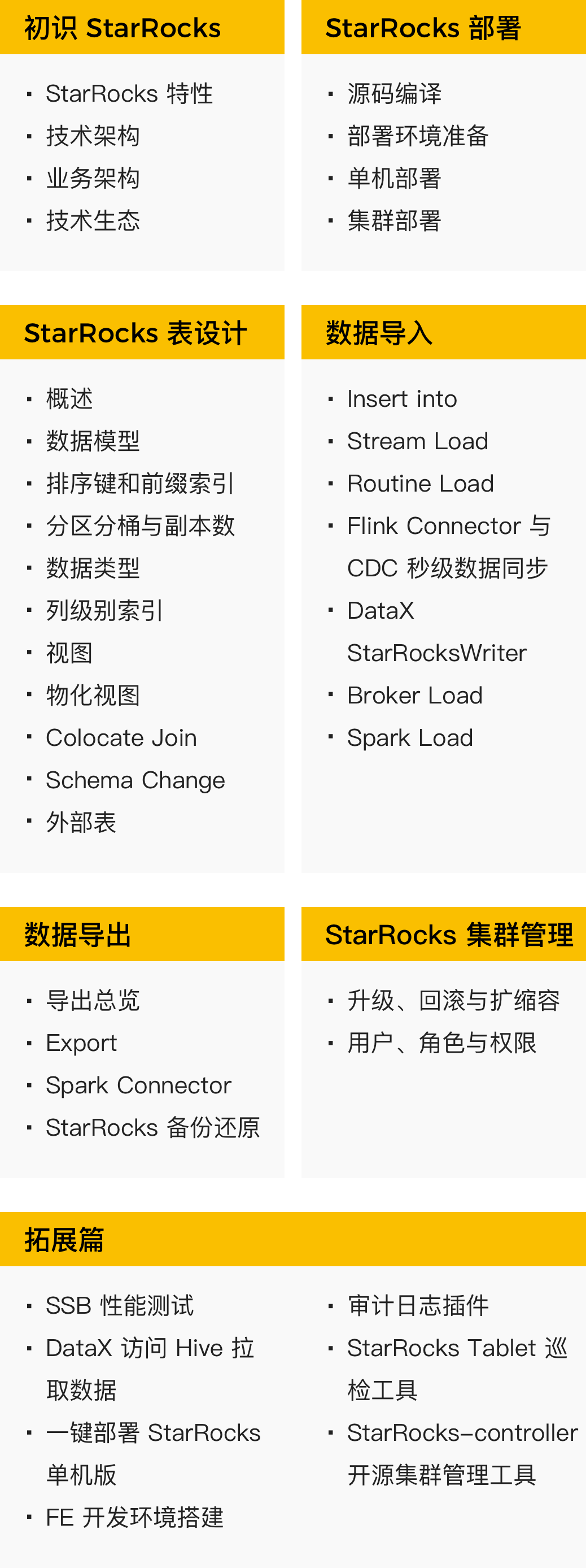 积极的反馈让我们意识到,除了产品使用手册之外,还需要通过更加场景化、系统性的使用教程,让数据库开发者自助地学习、测试、使用 StarRocks。