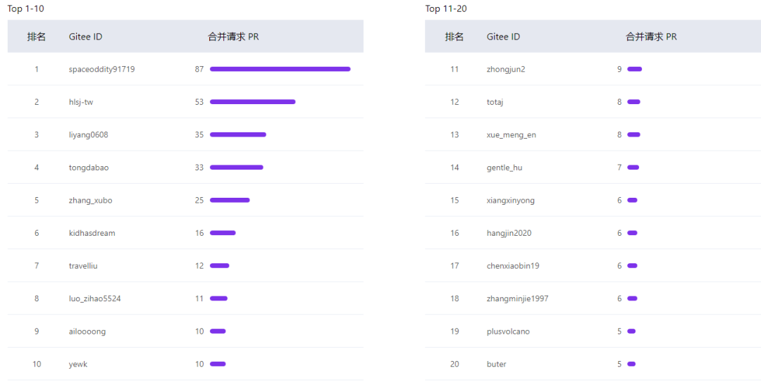 4月个人贡献PR第一的为spceoddity91719,共提交了87个PR;个人Issue贡献第一的为admin-eve,共提交了21个Issue; 个人评审Comment贡献第一的为liyang0608,提交了184个评审Comment。4月新增代码贡献者44个,期望能够给社区带来更多力量。