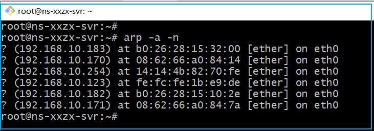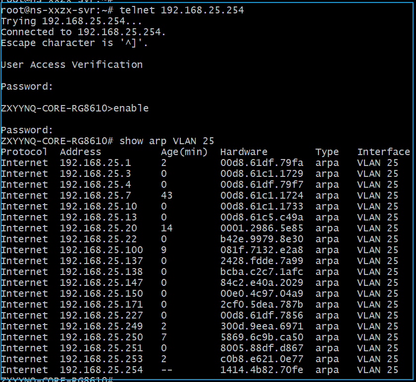 root@ns-xxzx-svr:~# telnet 192.168.25.254Trying 192.168.25.254...Connected to 192.168.25.254.Escape character is '^]'.User Access VerificationPassword:ZXYYNQ-CORE-RG8610>enablePassword:ZXYYNQ-CORE-RG8610# show arp VLAN 25