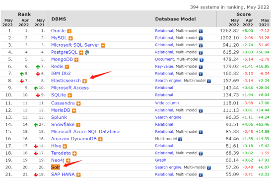 可以看出5月份的目前Elasticsearch排名为第七名,Solr的DB-Engines排名为第29名。