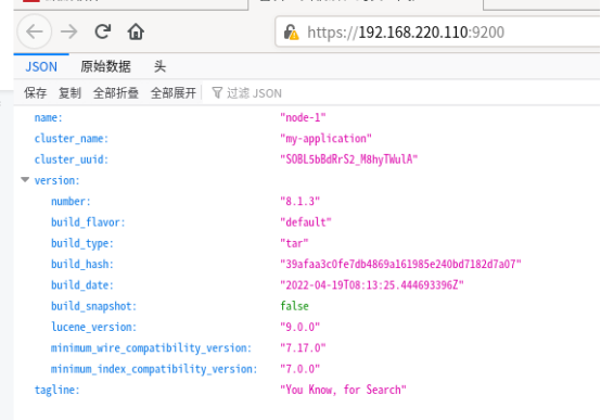 浏览器直接访问https://192.168.220.110:9200,会出现输入用户名、密码的弹窗,输入elastic和密码后,可看到elasticsearch信息。