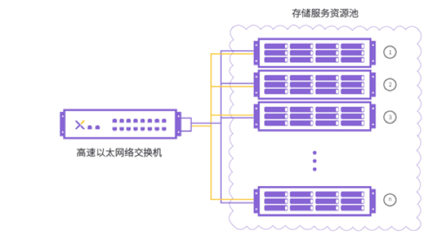 分布式存储系统使用高速交换机进行组网,并将分布式存储软件部署在低廉的X86硬件上。如下图所示: