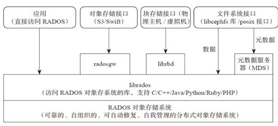 RADOS GW(RADOS Gateway)、RBD(Reliable Block Device)和Ceph FS(Ceph File System),高层应用接口,提供对象、块存储和文件存储服务。