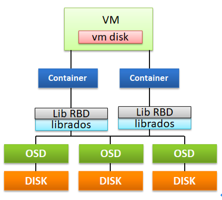 LibRBD是基于Librados的块设备接口实现,主要将一个块设备映射为不同的对象来实现。Ceph首先使用OSD服务将数据以对象形式存储在每一个集群节点的物理磁盘DISK中,然后通过LibRBD可以创建一个块设备(Container),最后通过QEMU/KVM Attach到VM上。通过Container和VM的解耦使得块设备可以被绑定到不同的VM上。