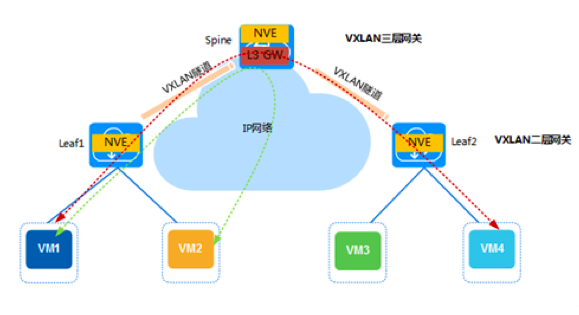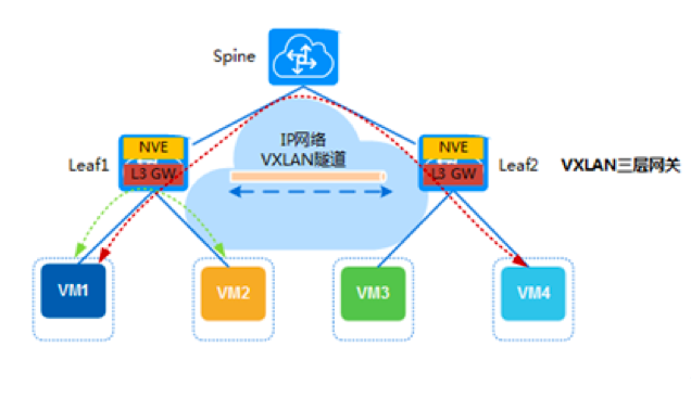 Leaf1、Leaf2和Spine作为VXLAN网络的VTEP,Leaf1和Spine之间、Leaf2和Spine之间分别搭建VXLAN隧道,并在Spine上部署VXLAN三层网关,即可实现不同部门VM之间的相互通信。